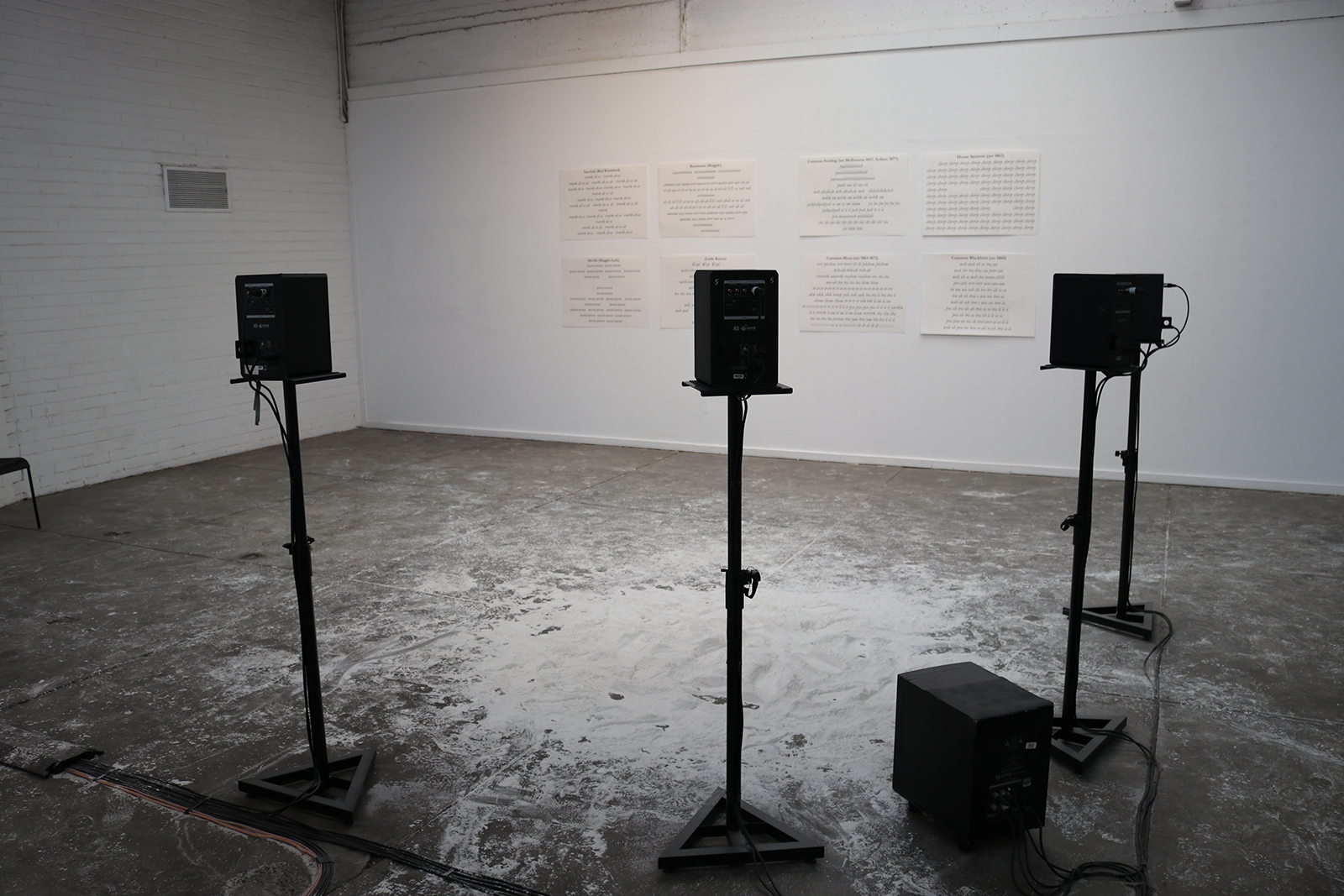 Quadraphonic sound, mixed materials, cornflour. Dimensions variable.